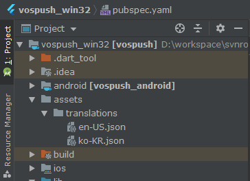 - 프로젝트 폴더 밑에 assets / translations / 폴더를 차례대로 만들고 json 파일 두개를 아래와 같이 만듭니다.